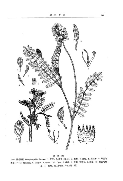 25. 竟生黄芪(云南植物研究)图版185: 7-12 Astragalus yangii C. Chen et Z. G. Qian (1997)*. 多年生垫状草本。茎多而铺散,长2-6厘米,近无毛或贴生疏柔毛。叶长1.5-3厘米;托叶卵形,长1-2毫米;小叶4-7对,长圆形或卵形,长2-3毫米,宽1.5毫米,顶端或微缺,下面疏被毛而上面较密,近无柄。总状花序头状,具3-6花,花序轴长约1厘米,明显短于叶;苞片披针形,长约1毫米,疏被毛,花无柄;花萼钟状,被黑色贴伏毛,萼筒长2毫米,萼齿近钻形,长1-2毫米;花黄色,旗瓣卵形,长约10毫米,宽约5毫米,顶端微缺,基部渐狭,爪不明显,翼瓣长约9毫米,爪长3毫米,龙骨瓣长圆形,长8毫米,爪长3毫米;子房无毛。荚果未见。花期8月。 产香格里拉(模式标本产地);生于海拔4150米的草坡中。