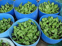 囤栽床的准备。选择温度能稳定地保持8~20℃的塑料大棚、日光温室或空闲房舍,用洁净的沙质大田土或粗河沙作栽培基质,铺成30厘米厚的囤栽床,整平后待用,如在阳畦可直接于地面上挖槽,宽约100~150厘米,以站在槽边伸手能够到槽中心为宜。深20~30厘米,长度依场地而定。需要控温且有条件的,可在槽底铺上地热线,再覆土3厘米备用。菊苣直根的处理。将菊苣的肉质根按不同长度分为大、中、小3级,掰掉烂叶,长于20厘米的根可把尾端切去。 囤栽方法。分别把不同大小的根栽植于囤栽床内,把同一级别的肉质根一个挨一个地码好。粗于6厘米以上的根可以紧挨码放,横径小于6厘米的根宜相距2~3厘米,码满一槽后,撒上沙或土填满间隙,浇足水,待水分渗透后,再覆土10~15厘米厚,槽上面留约20厘米的空间,设架,盖上黑色膜或其他遮光物遮光。若温度控制在18~20℃时,20天左右揭膜检查,见有黄白色芽捎尖刚露出覆盖的土或沙,即可扒开泥沙,收获芽球。每平方米约收芽球25公斤。使用过的槽床和沙土不能再囤栽,需另地再做。 为延长收获期,华北地区囤栽的最经济的方法还可在室外露地,于冬季封冻前挖槽沟(方法与保护地相同)把菊苣的根株栽植于槽沟内,覆盖细砂土或河沙约20厘米,上加盖草帘或露天在自然气温下越冬,但早春需经常检查,冬季不盖草帘的可延至4月上旬收获。
